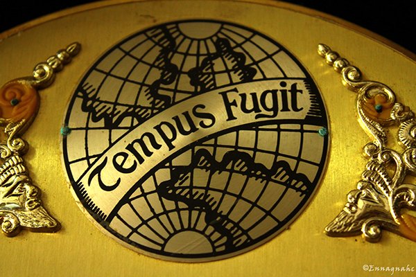 La frase tempus fugit se ha visto frecuentemente grabada en relojes, relojes de sol, marcadores de tumbas y edificios, como recordatorio constante de la fugacidad del tiempo.